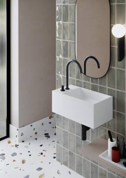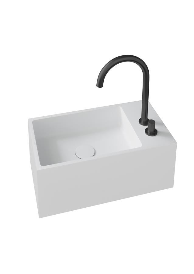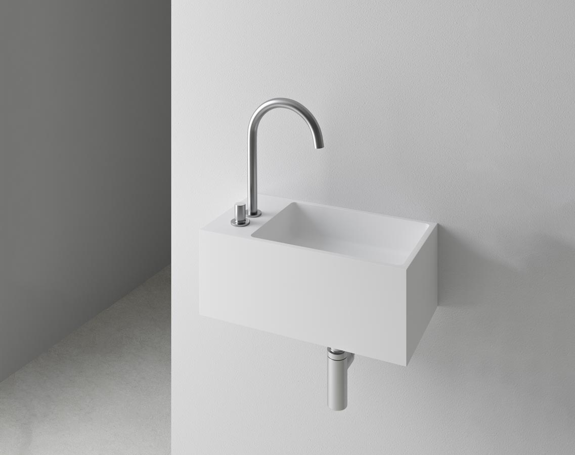 Guest Waschtischkollektion wurde geschaffen, damit auch kleinere Badezimmerinden Design und Funktionalität Genuss kommen , und nicht auf aktuelle Trendsverzichten müssen. Erhältlich als Wand-oder Tischversion-, aus Scene® solid Surfacehergestellt, d.i., kompakten Materialien auf Harzbasis und mineralischen Füllstoffen.Zwei Formate entwickelt, Guest L, Abfluss links und Guest R, Abfluss rechts. GlatteOberfläche und reinweisse Scene Carta RAL / NCS®-Farbe mit der Möglichkeit derAussenfarbe in der Basics-, Trend-und Sonderfarbpalette, RAL oder NCS.