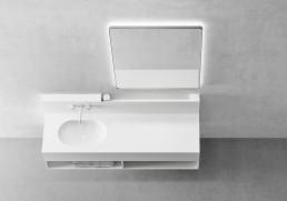 Ausgehend von den gewünschten Tischplatten Abmessungen können 37 verschiedene Designs sowie die gewünschte Anzahl der Waschbecken und deren Position auf dem Waschtisch ausgewählt werden. Diese Serie bietet auch die Möglichkeit, Zubehörteile zu wählen, um das Waschbecken mit Schubladen, Handtuchhaltern oder Sockelleisten auszustatten.