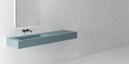 As can be seen in these photos by Irene Díaz, the colorful mural with steel pieces and Hidrobox products stand out in the design. Both the freestanding bathtub from the Space collection and the sinks from the FS collection attract attention due to their elegant shapes and the customization of the color in a blue tone. In addition, both are created with our solid surface Scene®, a compact, homogeneous material with a renewable surface.