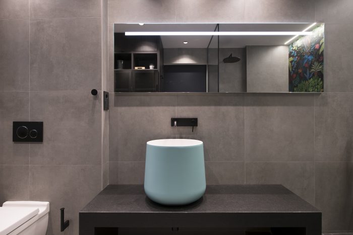 As can be seen in these photos by Irene Díaz, the colorful mural with steel pieces and Hidrobox products stand out in the design. Both the freestanding bathtub from the Space collection and the sinks from the FS collection attract attention due to their elegant shapes and the customization of the color in a blue tone. In addition, both are created with our solid surface Scene®, a compact, homogeneous material with a renewable surface.
