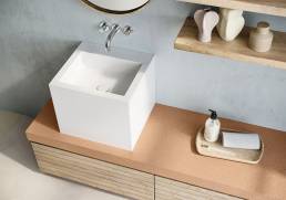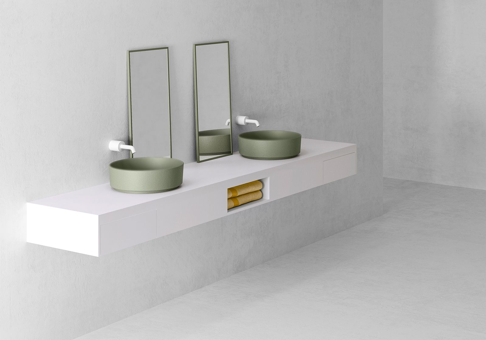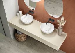 La collection combine la finition lisse du Scene avec les tex-tures ciment, ardoise et Microtex du Kromat, multipliant ainsi les options de décorations, de possibilités de couleurs et de compléments (étagères, crédences, tiroirs ou porte-serviettes). Au-delà des variétés de formats et d’options que la série présente, ce sont les surfaces naturelles, élégantes, agréa-bles et extrêmement résistantes qui caractérisent Artop.
