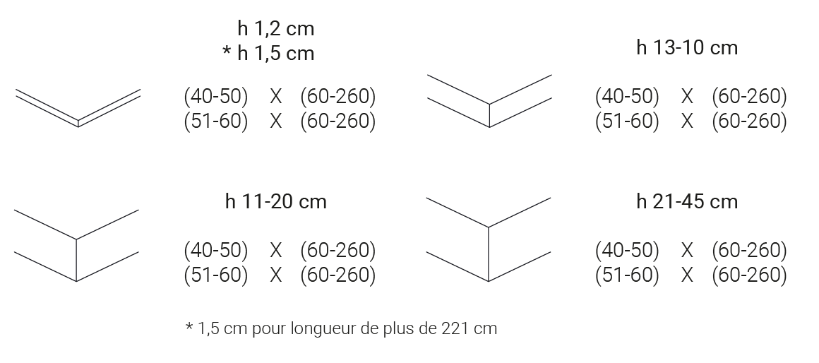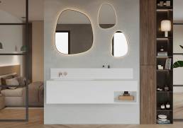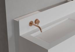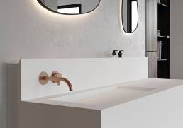 Chacune de nos pièces est méticuleusement étudiée et dévelo-ppée de façon individuelle. Une fois définies les dimensions du plan souhaité, il ne tient qu’à vous de faire un choix entre les 37 designs de vasques différentes, le nombre de cuves à intégrer et leur situation sur le plan. Cette série propose aussi une sélection de compléments pour équiper le plan de toilette comme des tiroirs, des porte-serviettes ou des crédences.