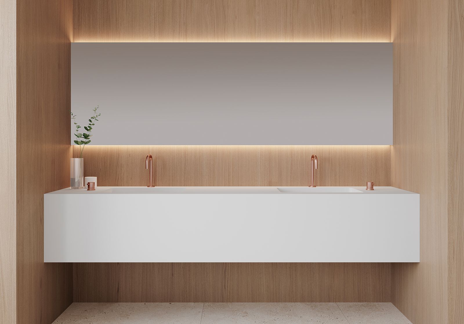 La série de plans de toilette avec vasque intégrée Program naît de la volonté de proposer un large éventail de possibilités pour élaborer le lavabo désiré pour chaque espace.