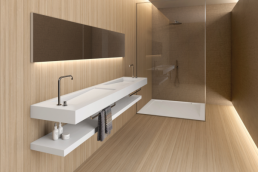 È un composto compatto, senza porosità in superficie e all’interno, a base di resine e svariate cariche minerali. La sua composizione è innovativa, e possiede una superficie esterna in gelcoat iso npg di massima qualità, che dona un’elevata durezza ed eccellenti caratteristiche al materiale, adatto all’ambiente bagno.