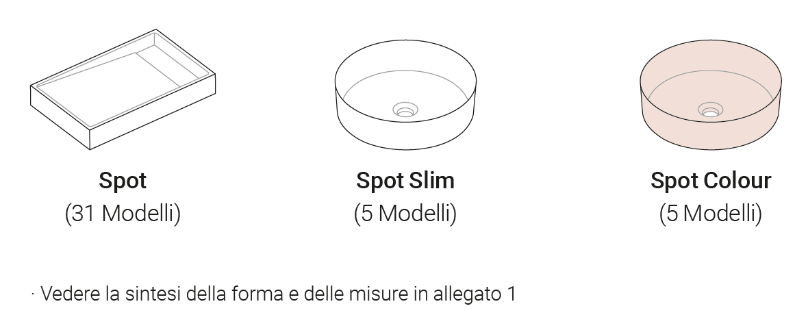 I lavabi Spot, si presentano in texture liscia, con diverse forme e concetti, fino a 32 varianti. Realizzati in Scene, offrono forme particolari nel classico bianco puro, dando la possibilità del bordo slim.