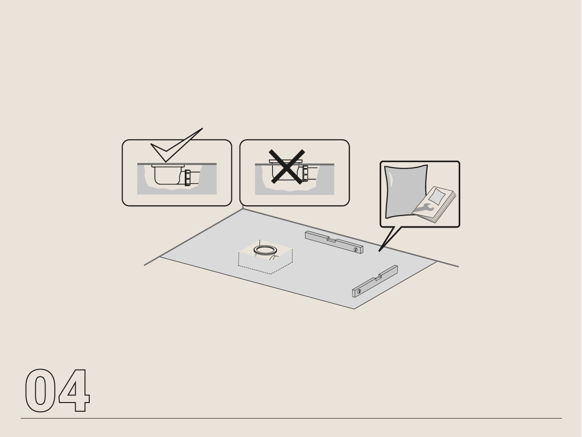 La zona que servirá de soporte para el plato de ducha debe estar firme y nivelada, ya que el plato de ducha copiará en su totalidad la base donde se instale. Una vez instalado las posibilidades de reajuste son mínimas.