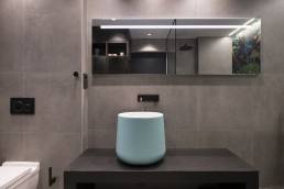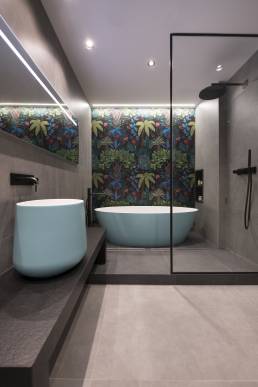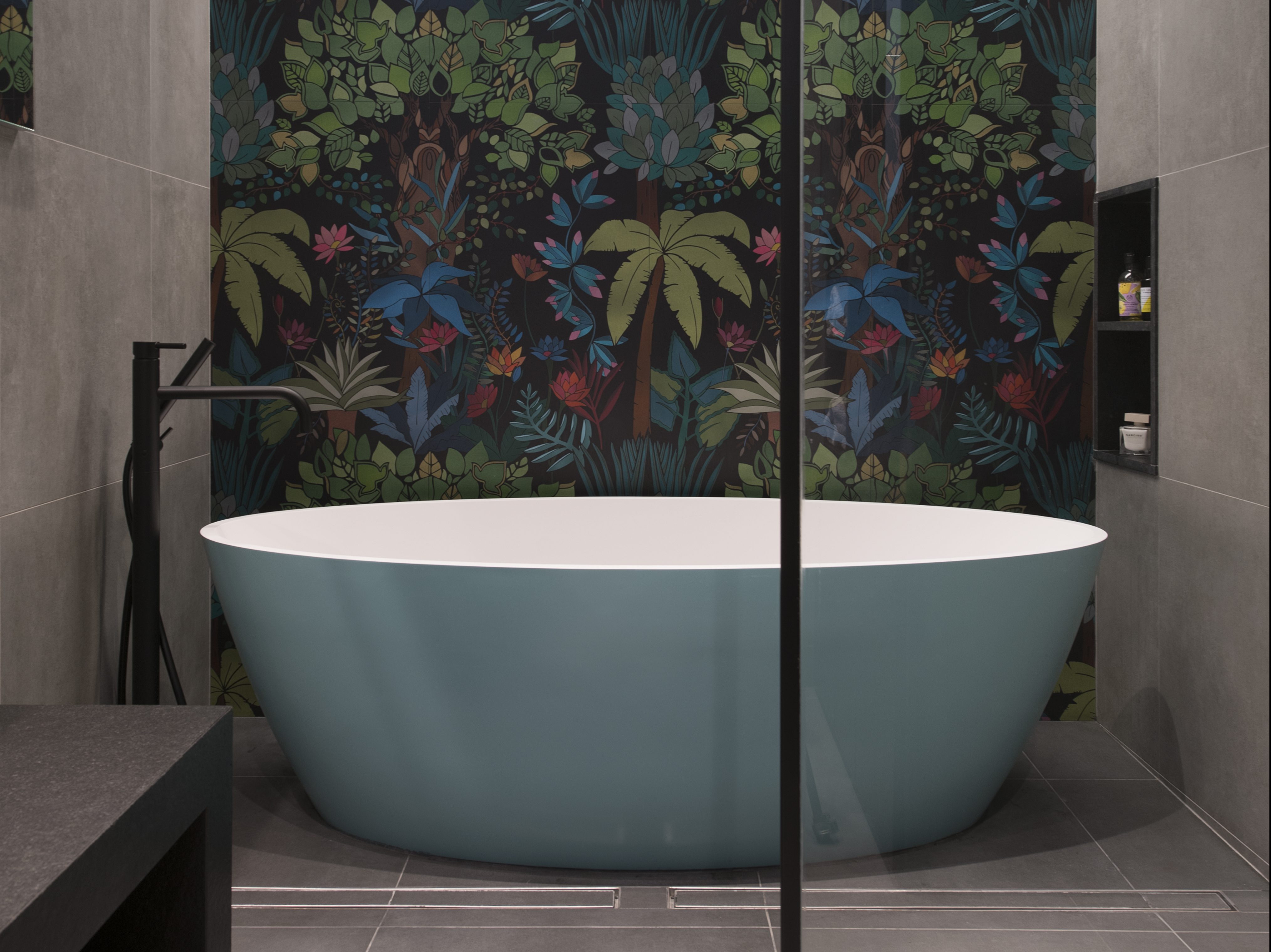 Como se puede observar en estas fotos de Irene Díaz, en el diseño destacan especialmente el colorido mural con piezas de acero y los productos de Hidrobox. Tanto la bañera exenta de la colección Space como los lavabos de la colección FS llaman la atención por sus elegantes formas y por la personalización del color en tono azul. Además, ambos están creados con nuestro solid surface Scene®, un material compacto, homogéneo y de superficie renovable.
