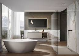 Bañera exenta de forma ovalada y líneas modernas que ofrece un espacio de relax donde se unen el confort y la exclusividad. Fabricada en Scene®, cuenta con una textura suave y mate muy agradable al tacto. La bañera Space en un elemento de diseño que aporta distinción tanto para espacios amplios como para otros más reducidos al estar disponible en tres dimensiones diferentes.