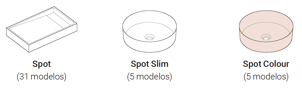 Los lavabos Spot, para instalación sobre encimera, se presentan en textura lisa y cuentan con desarrollos de diferentes formas y conceptos hasta alcanzar 32 variantes. Fabricados en Scene®, el blanco de la materia y las formas del diseño, algunas de ellas de gran identidad, visten la encimera ofreciendo muchas alternativas de elección y, en entre ellas, algunas con características “Slim” de reducido espesor.